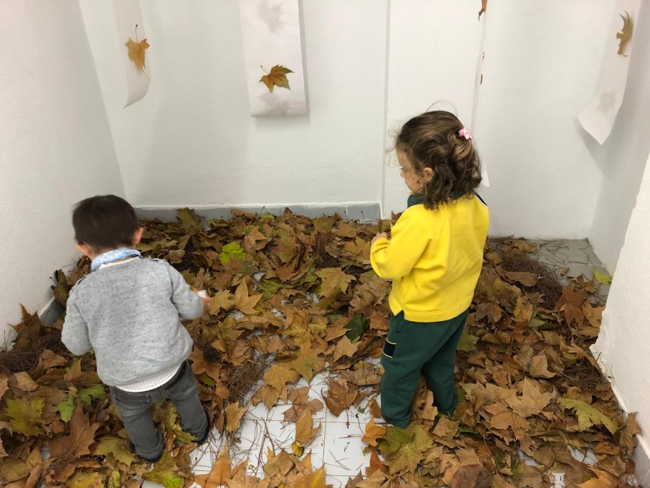 Pero aquí no acabaron todas las sorpresas del otoño, cuando subimos a la parte de arriba, la salita de psicomotricidad se había convertido en una gran sala del otoño, llena de hojas secas donde los niños podían saltar, jugar o meter las hojas en botes de diferentes tamaños.