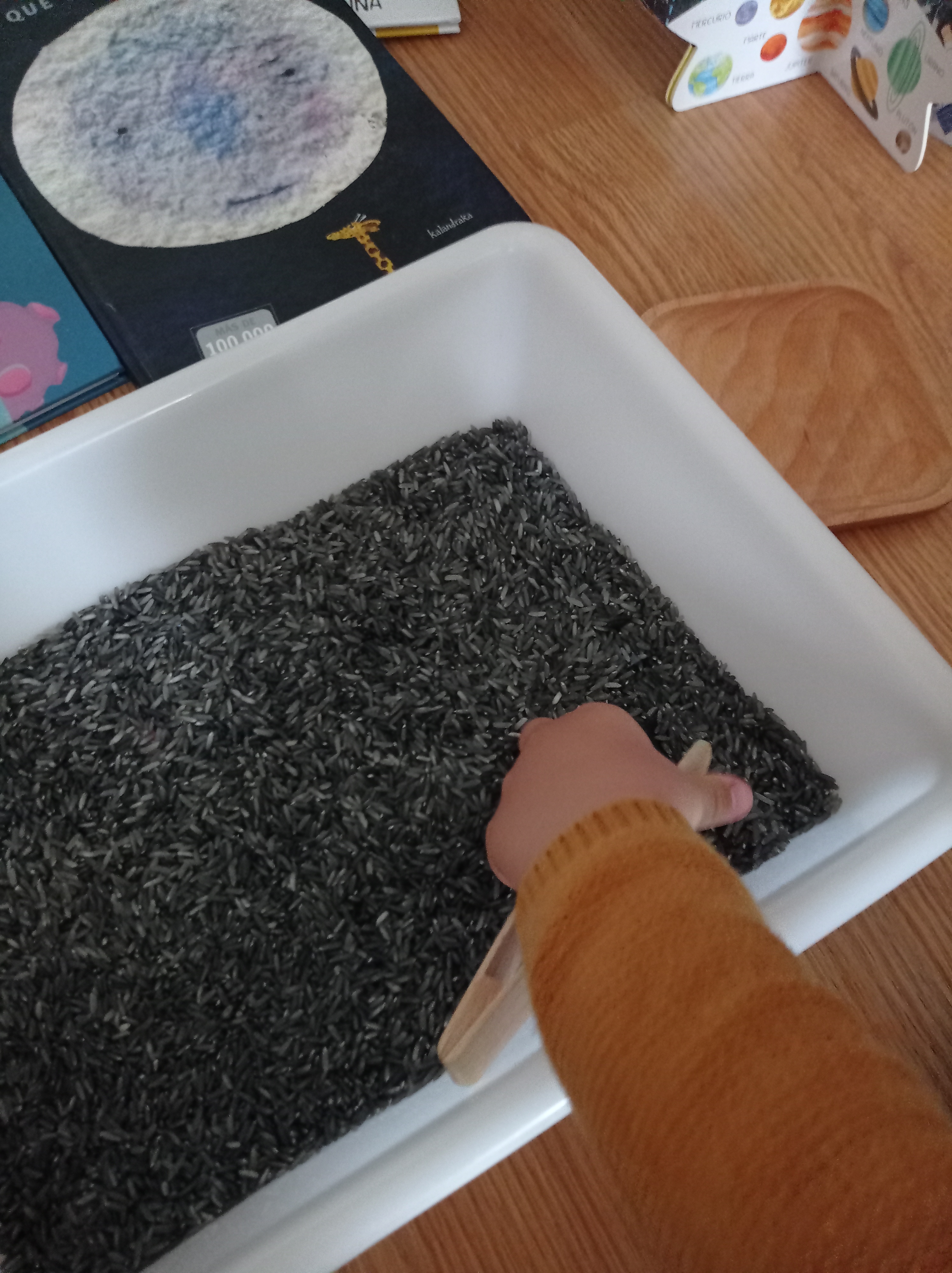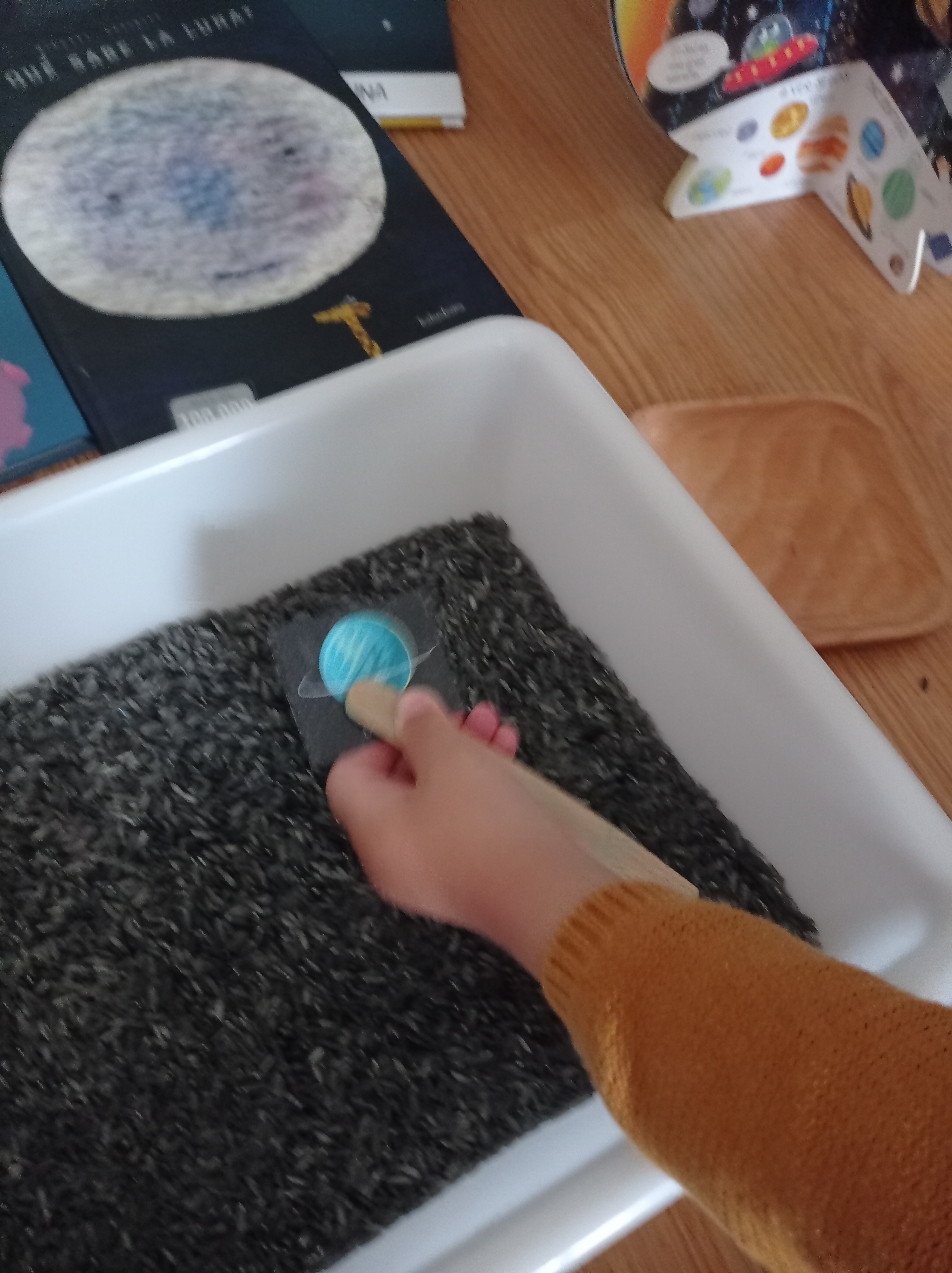 El cuento de El espacio en 3D, de la Editorial San Pablo, lo puse abierto al lado de la bandeja sensorial y con una pequeña bandejita de madera para que pudiera dejar el Planeta que encontrara y buscarlo en el libro.