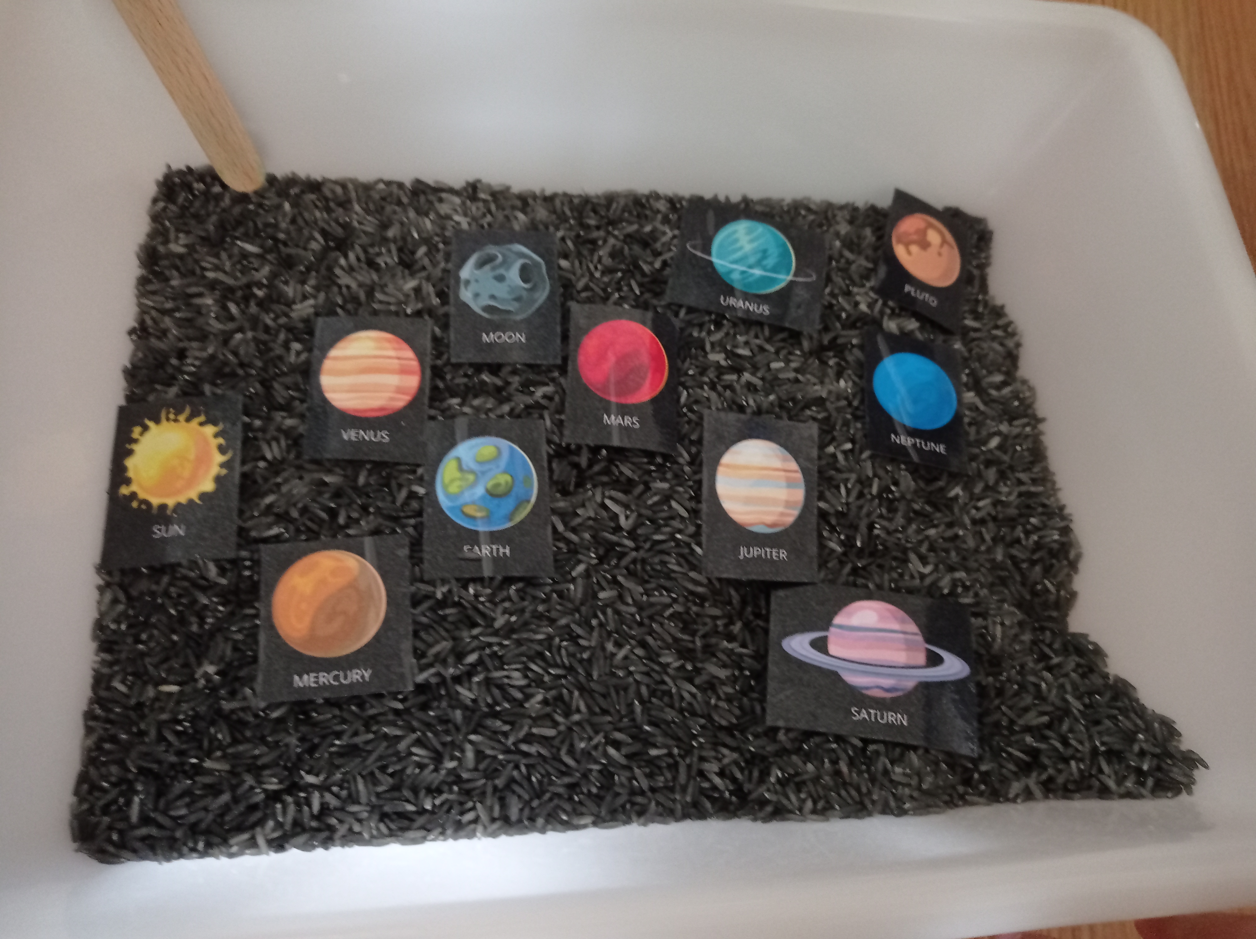 Todos los Planetas impresos y plastificados encima del arroz y los enterré con mucho cuidado para que no quedaran a la vista.