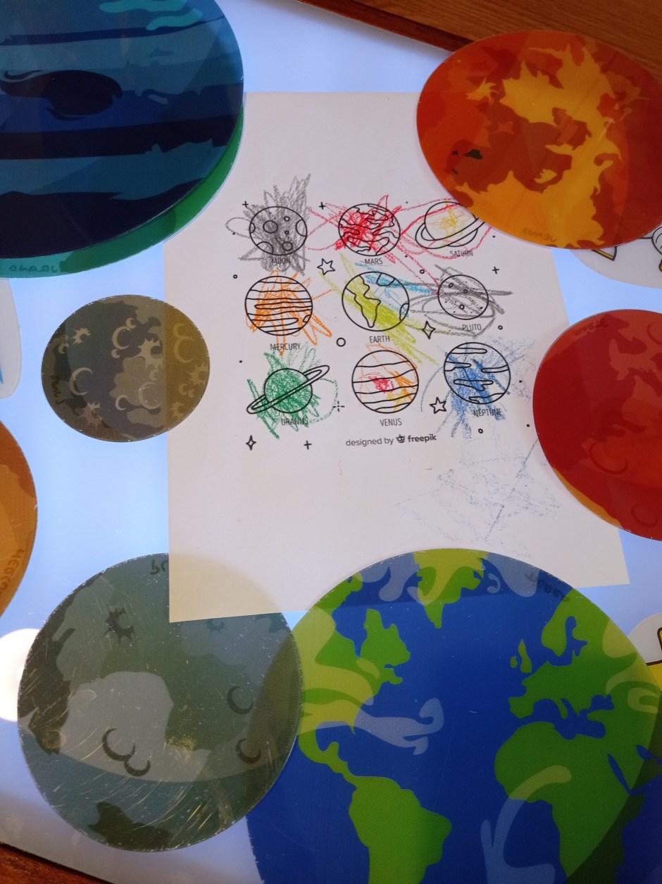La mesa de luz también preparada y los planetas para colorear cerca… estaba todo listo para el taller.